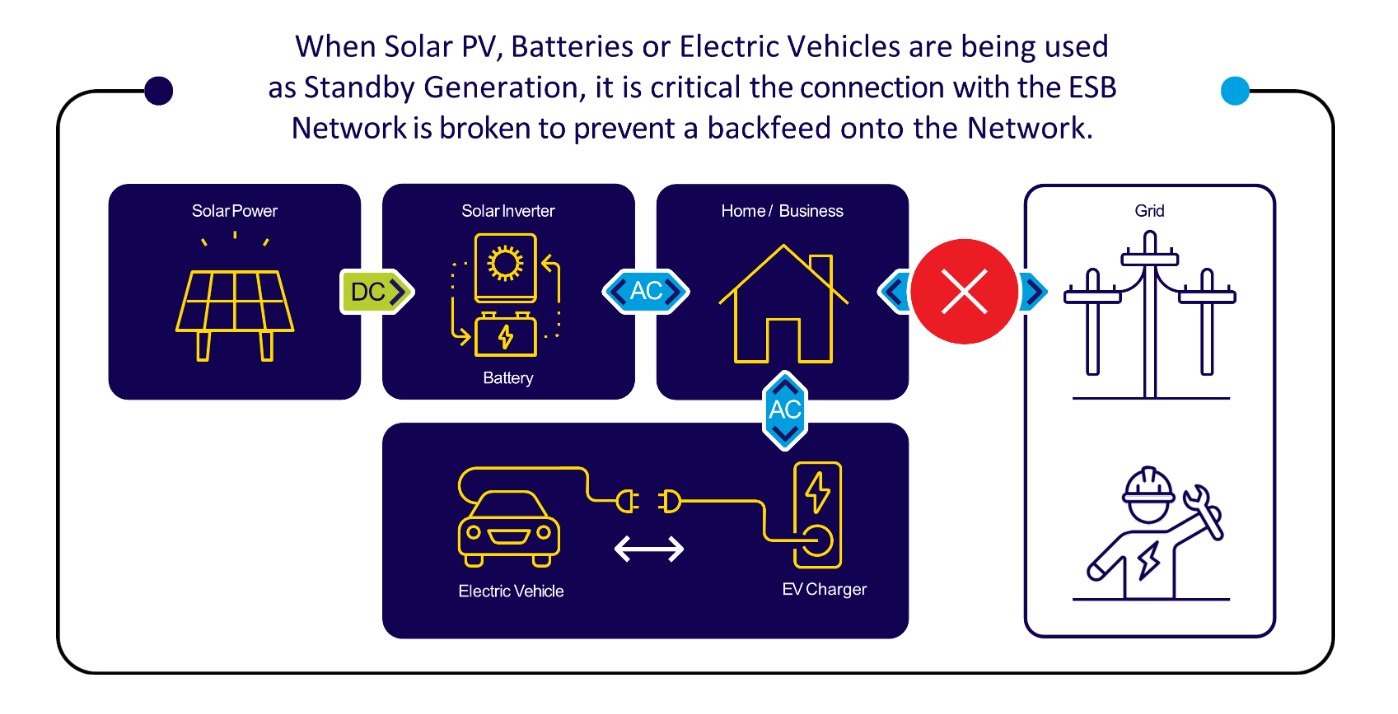 Yes, these sources of generation may be used in the event of a loss of mains electricity supply. In normal circumstances solar PV, batteries and Electric Vehicles run in parallel with the mains supply from ESB Networks. However, if they are to be used as a source of standby generation (i.e. island/off-grid mode) they need to be designed, installed and tested for correct operation by a Registered Electrical Contractor (safeelectric.ie). As per the above, an appropriate changeover switch to break parallel with the ESB Networks mains electricity supply as per National Wiring Rules for Electrical Installations shall be used.